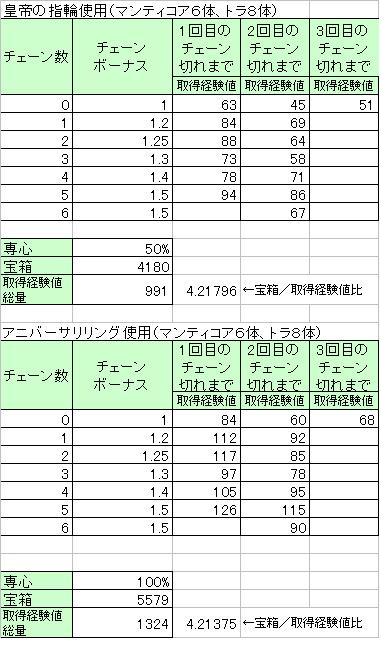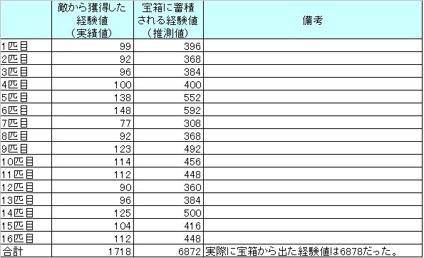 ビースト・修行・電光石火・落し物・修行・偉力を入れてみた。 (電光石火はあまってたから入れただけ。) 経験値に関わるのは、 ・敵のレベルが高くなる偉力 ・宝箱からの経験値量が増えるとされる修行 の認識。 前回、皇帝の指輪有りと無しで、宝箱の経験値量が違う事が分かっていた。 3アカ目のガルカを見てみると、アニバーサリがあり、これをつけるとどうなるのか気になったので、実際に使って行ってみた。 また、今回は、倒した敵の数や、取得経験値を記録しておく事にした。 ↓の表は、2アカの経験値取得結果を表す。 ・構成は、忍モ赤詩の4人であるため、PTの人数補正はある。 ・いずれもLV75であるためレベル差補正は無い。 ・4キャラ全員同じダンジョンにおり、死亡・離れすぎ等での経験値取得漏れもなかった。 ・マンティコアが6体 ・トラが8体 ・マンティコアはチェーンで倒しきった。(5チェーン) ・トラは、6チェーンまで達成した(7匹撃破)後、1匹をチェーン無しで倒した。 その結果、皇帝有りでは敵を倒した際に得た取得経験値総量が991、宝箱からは4180だった。 アニバーサリ使用では、同1324、5579だった。 メイズ内で獲得した経験値量に応じて、宝箱から得られる経験値が変わると言う事は分かったが、 箱から得た経験値と、実際に得た経験値の比は 皇帝が約4,218倍、アニバーサリが約4.214倍となった。 凡そ4.2倍になる事は分かったが、小数点以下の仔細が異なる。 ここから分かる事は少なくとも、プレイヤーが実際に得たの整数の経験値*n倍という単純なものではないと言う事である。(計算自体は単純かもしれないが・・・) また、今回のやり方では、事象の切り分けが非常に難しい。 ・チェーンボーナスは算定の対象となるか? ・メイズ内の敵は、通常エリアと異なり経験値量が少ない。 何らかの補正が加えられているようだが、これらの補正が計算に影響している可能性もある? ・また、その補正は通常の経験値テーブルを元にして割り出せる仕組みであるか? ・経験値の算出時に、小数点等を切り捨てた上で計算しているのか?小数点混みで計算しているのか? 実際に確認できるかどうかはともかく複雑なので、 真面目に検証しようと思うと色々と仮説を立てて推測しながらやるのが望ましそうである。 とりあえず、そんなに細かい事考えたくないよwww 大体でいいから教えてwww と言う人であれば、 ・修行の契約をして成功した場合はメイズ内で稼いだ経験値+箱からその約4.2倍もらえる。 ・3人で偉力+修行したとき、Rocタイプ6、コカ6で、殲滅後に箱もらえた経験値は約4200前後だった。(前回挑戦結果・皇帝あり。指輪無しだと2745だった。) ・4人で偉力+修行したとき、マンティコア6、トラ8で箱は皇帝ありで4180(+雑魚からは991)、アニバで5579(+雑魚から1324)だった。 と言う事から、 ⇒女帝・皇帝の指輪を使った上で、偉力+修行をすれば3~4人でも1回で約5000ほど稼げる! と言う事だけ覚えておけばOK。なんだか昨日の記事とあんまり変わらなくなってしまったなあ。 【今後の検証について】 正直、自分は細かい事を考えるのは嫌いではないんだけど、実運用でさしたる影響が無いのであればファジーで良いと考える傾向がある。 その為、これ以上の調査を行うかどうかは不明。 ただし、気が向いている間には、レベルが低いキャラを1名と75で経験値得られないような敵を用意し、メイズ内で解散、ソロで1匹倒させてから、残りを無双で倒し、箱から得られる経験値を探るなどの事はしてもいいと思う。 もし、修行の契約について細かい仕組みを理解済みの人がいたら、何か教えてもらえるとありがたいですね。 主流?の武器集めもさることながら、こんな感じな遊び方も出来ると言う事がわかってきた。 シュシュがストレスの元だけれど、もう嫌になった人も多いのか、実装直後と比較して入るのはかなり楽になっているし、ピークをはずせば予想以上には使えるな、これ。 自分の中でモンガーに対する評価は良い方向に改められたといえる。 2009.01.14 Wed 14:30:19 3人モンガー 偉力+バード+おとしもの+大兵(土ブースト)+修行最近LSのネコ・1st・2ndでやっているメイズモンガー。