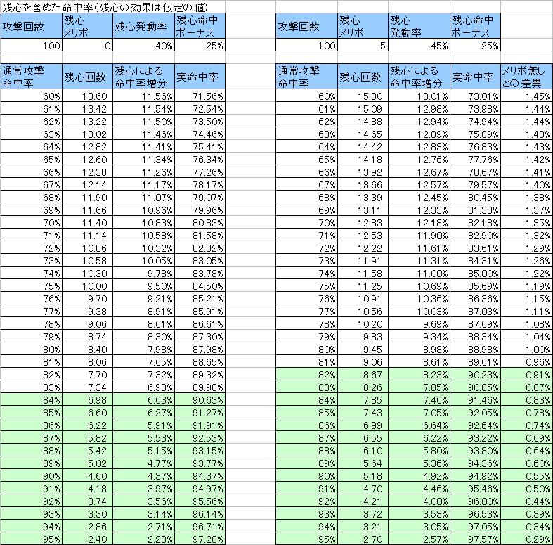 とりあえず、伸び具合が悪くなる正正堂堂の4~5段は後回し。 両手刀スキルを先に8段にしようと検討中。 隔450の武器で6振り、または480の武器で5振りがある程度実用できるレベルであればストアTPは5段未満にしておこうかな。 その後は、心眼とか色々考えているけどどうするか。 知り合い何人かに侍のメリポの振り方を聞いてみたところ、ストアTPと正正堂堂はほぼ意見が同じ、その他はグループ1は黙想・心眼・残心確率に5段、グループ2は士気高揚1と意気衝天4や、意気衝天に5段、峰打ち5段と人によって振っている内容が異なった。 峰打ち5段は相当珍しい部類のような気がするとして、意気衝天が正正堂堂の次点にあたるようだ。 さて、グループ2の話はここまで。 今回はグループ1残心確率アップがいいと言う意見を唱える知り合いがいたんだけど・・・その時は【へぇー】みたいな事は言ったものの、残心確率アップって正直どうなんだろうね。 細かい計算は必要になったらするとして、正直怪しいとしか思えなくなってきたのでかるーく考えた。 残心について ・攻撃ミスをした場合に発動することがある。(ダブルアタックと言うより、ミスした攻撃に対する再判定) ・残心時の命中率にはかなりの補正が掛っている ・残心発動率はおよそ40%と言われている。 ・意気衝天によるTPボーナスの恩恵を受ける(命中時の得TP+1段につき+3) 残心の特徴 ひとえに残心が発動し命中する回数=攻撃ミス回数×残心発生率×命中率(残心補正有り)につきる。 通常攻撃の命中率が上がるほど攻撃ミスが減少するため、残心の発動回数は減る傾向にある。 攻撃ミスが減るほど残心発動判定の回数が減るため、残心の発動確率が増加してもその恩恵は受けにくくなる。 残心発生率を5%上げたとしても、実際に残心が発生する割合は、通常攻撃を含めた全体の割合からすればその値通りには発生しない。(命中率全体で5%上がるわけでもない。) メリポ等で実用的な命中率は90%以上であるとすると残心を含めた総合的な命中率は以下の場合にそれを確保できる。 残心確率アップ無しの場合、通常攻撃の命中率が84%以上 残心確率アップ5段の場合、通常攻撃の命中率が82%以上 (画像をクリック) 画像内では、100回攻撃した場合を書いているけど、この100回は純粋に通常攻撃を行った回数と言う意味。 この100回通常攻撃をしてミスったうちから残心が発動するが、この残心回数は100回のうちには含まれない。 残心というのはミスした攻撃に対する再判定なので、残心で命中した場合はミスが無かったように考える事とし、残心で命中すると考えられる分を命中率ボーナスの扱いとして合算して最終的な命中率を計算している。 ※10/15 命中95%キャップを計算し忘れていたので修正 結局、残心確率アップに5段入れても、全体からみた残心の発動回数は100回の攻撃中1回未満の増加に留まる。 この増加分を有効な強化と見なせるかは個々の判断によるだろうが、この増分のためにメリポ5段を入れるかと言うと、コストパフォーマンスは悪いので別のものに振ったほうが良いと考える。 心眼5段にして青眼時のリキャストを5秒減の25秒にしたほうが、盾時の被弾数を減らせる。 黙想5段にしてリキャストを30秒減にしたほうが、WSの回転率は上がるだろう。 30秒早くTP100増するメリットと、実際の残心の発動回数を1%弱増加させるメリットを考えた時にどちらを取るか。 と言われたら、黙想や心眼が残心と比べてどの程度良いのかをしっかり検討していないので上述の内容だけでは完全な比較は出来ないけれど、残心上げるよりは他のを上げたほうが良いと思う。 意気衝天の効果をより高める工夫として、メリポグループ1の残心確率アップを上げるという選択肢は個人的には無しだと思うのですよ。 |